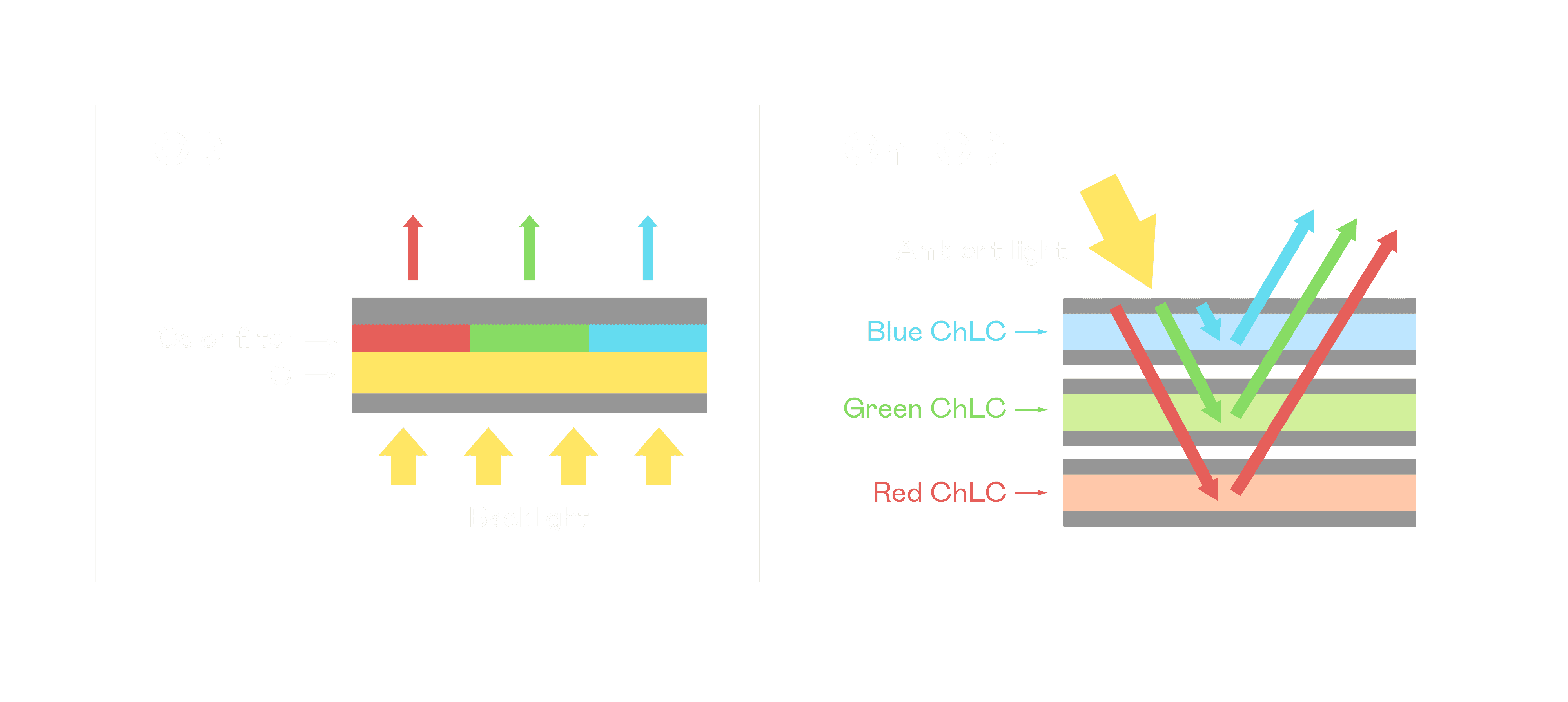ChLCD 胆固醇液晶就如同纸张一样,,,透过反射环境光来显示影像,,因此长时间观看不易造成人眼视觉疲劳,,可达到护眼效果。。。。当处于户外阳光下使用,,LCD 影像容易失真而不易观看,,,但胆固醇液晶仍可维持较佳的影像品质。。。。